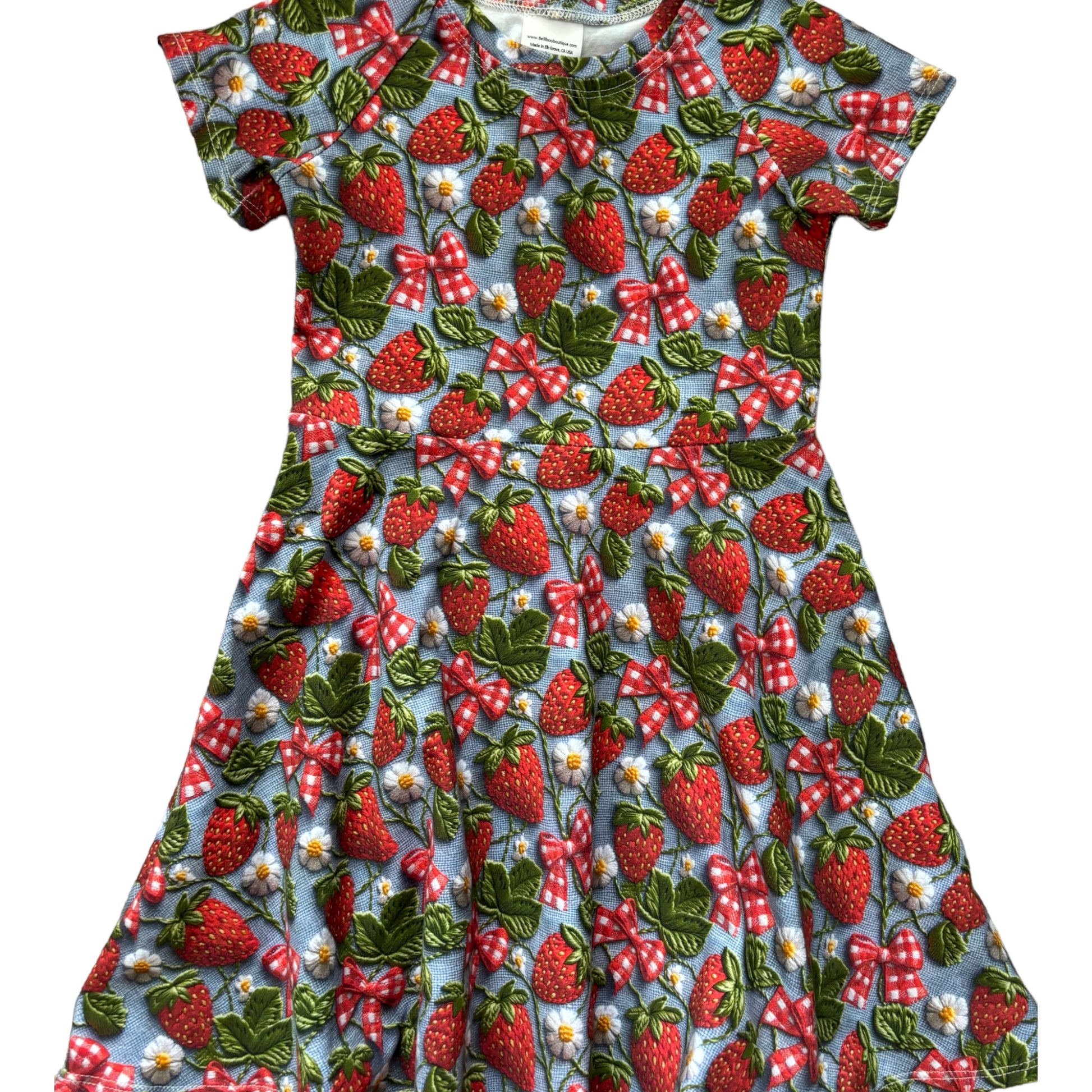 Your little one will look berry sweet in this handmade strawberry dress! Crafted from soft, breathable knit fabric, this dress features short sleeves and a full circle skirt—perfect for twirling and all-day play. The vibrant strawberry print adds a fun, fresh touch, making it ideal for spring and summer outings.