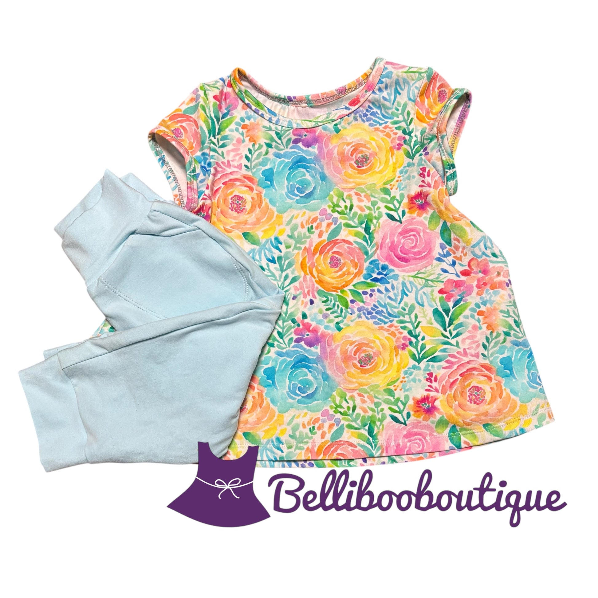 Sweet and comfy handmade two-piece set featuring a short-sleeve floral knit top in yellow, pink, and blue. Paired with soft light blue joggers with functional pockets, this outfit is perfect for everyday wear. Size 5
