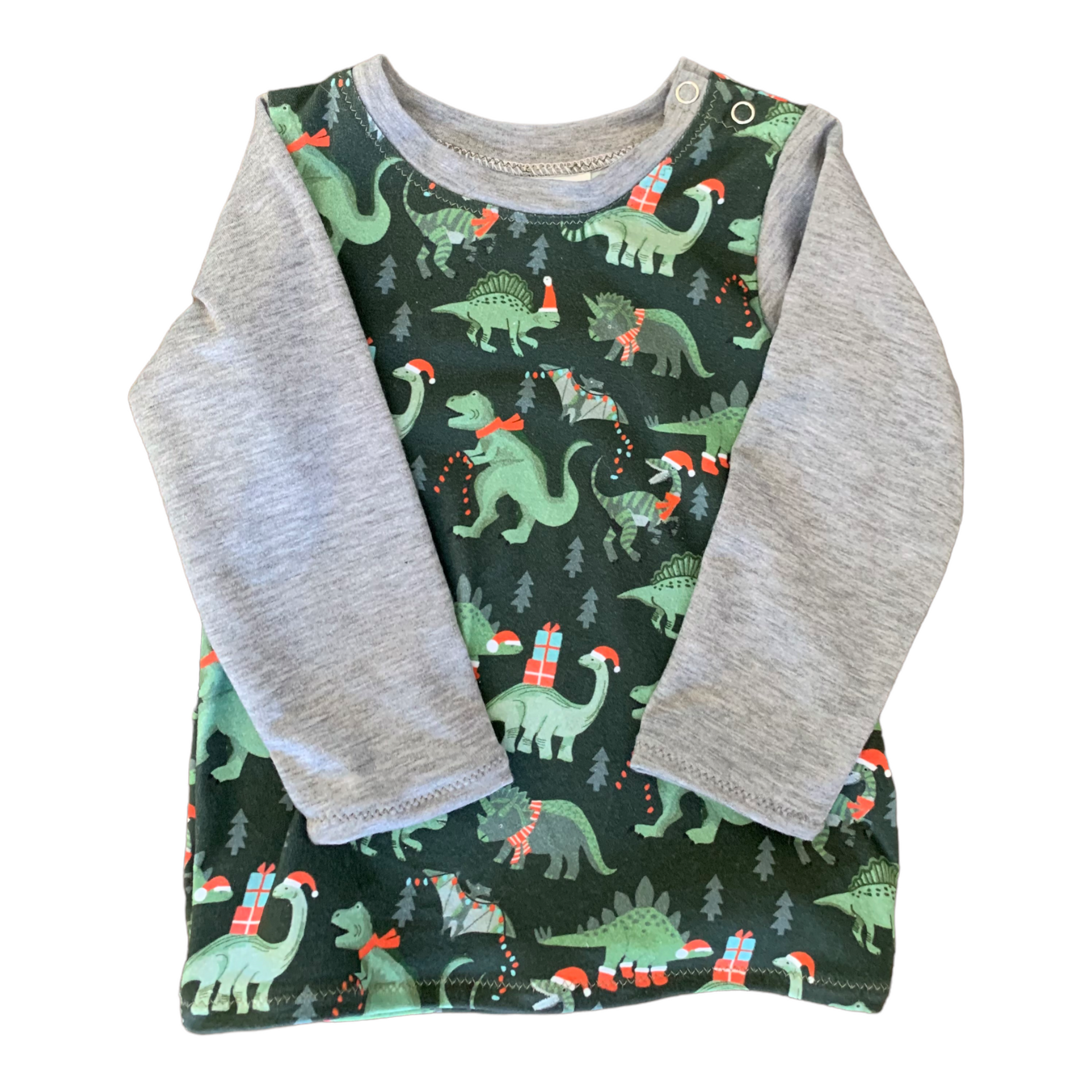 The perfect shirt to celebrate the holidays with! Features the cutest Dino in Santa hats, has two snaps on shoulder to help with dressing.