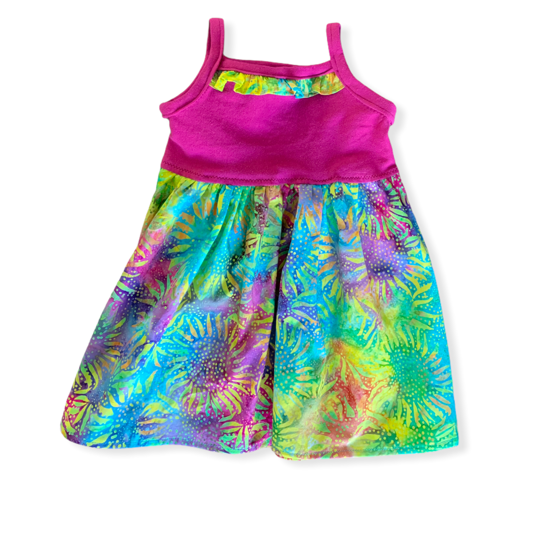 Beautiful sundress featuring a cute little bodice ruffle. Bodice is soft knit fabric and the skirt is beautiful cotton fabric featuring rainbow sunflowers